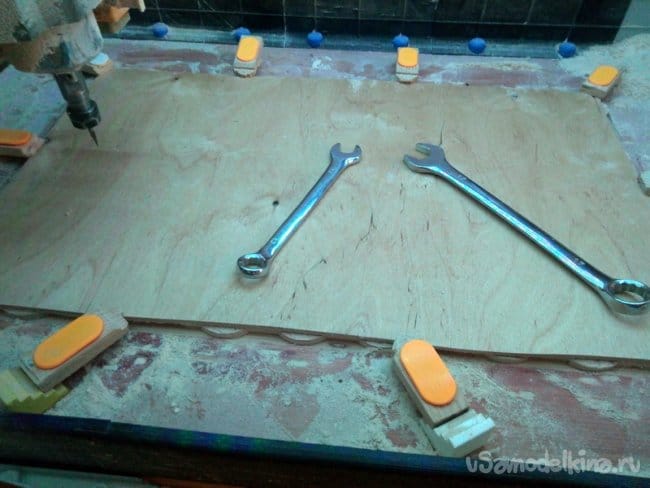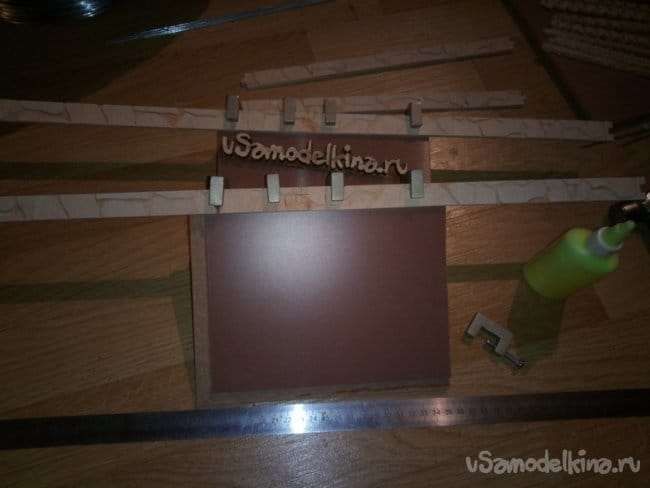 Дальше собираю и склеиваю сборные части. Использую клей ПВА, несколько струбцин (тоже самодельных) и обрезки ламината для относительного выравнивания и притягивания при склеивании.