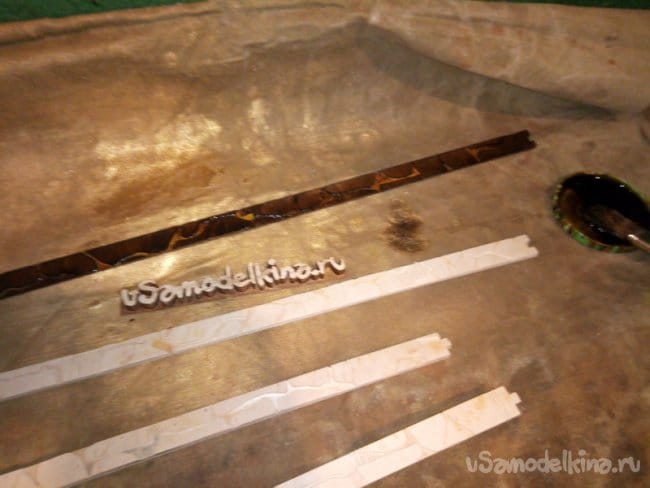 Ниже на фотографии показан процесс покрытия деталей. Высохнет (примерно через час) снова немного шлифану верхи . Получается немного засветление "камней".