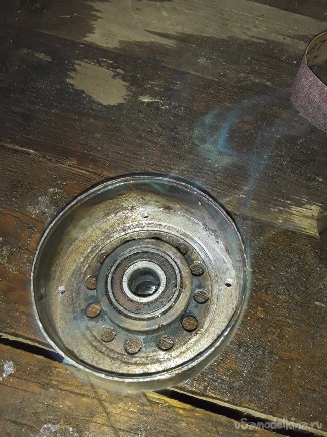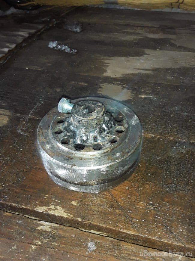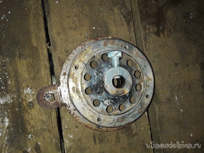Для ведущего ролика нашел подходящего диаметра кожух от какого-то двигателя диаметром 100 мм. Болгаркой отрезал все лишнее на Грин дере отшлифовал и приварил в центре муфту с внутреннем диаметром вала двигателя.