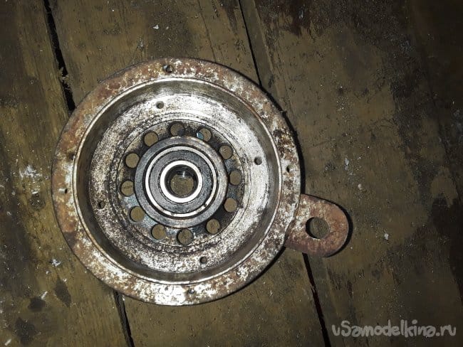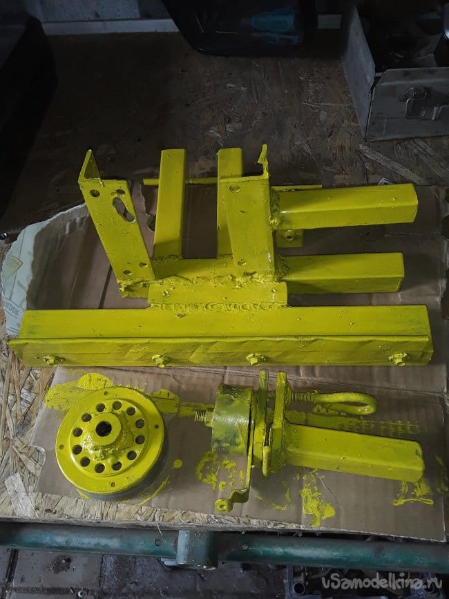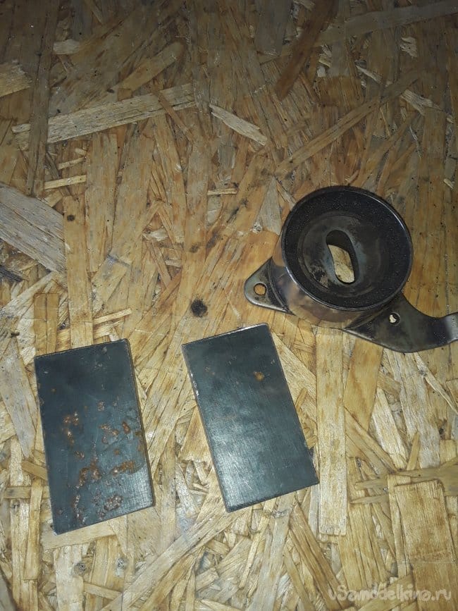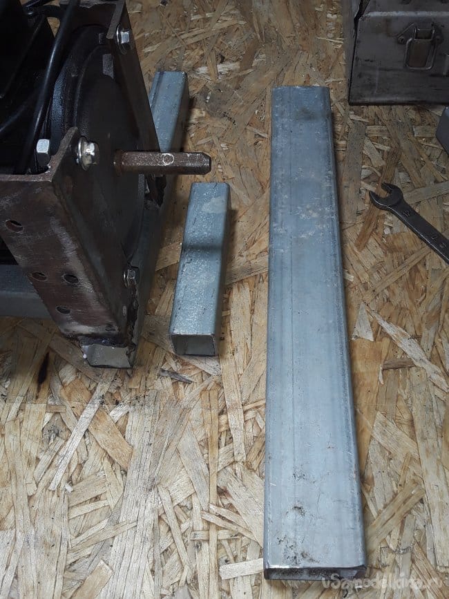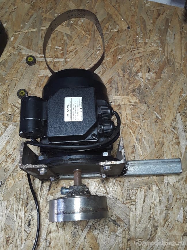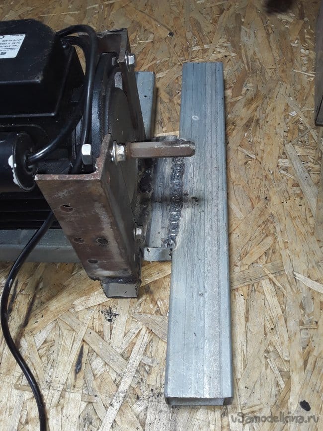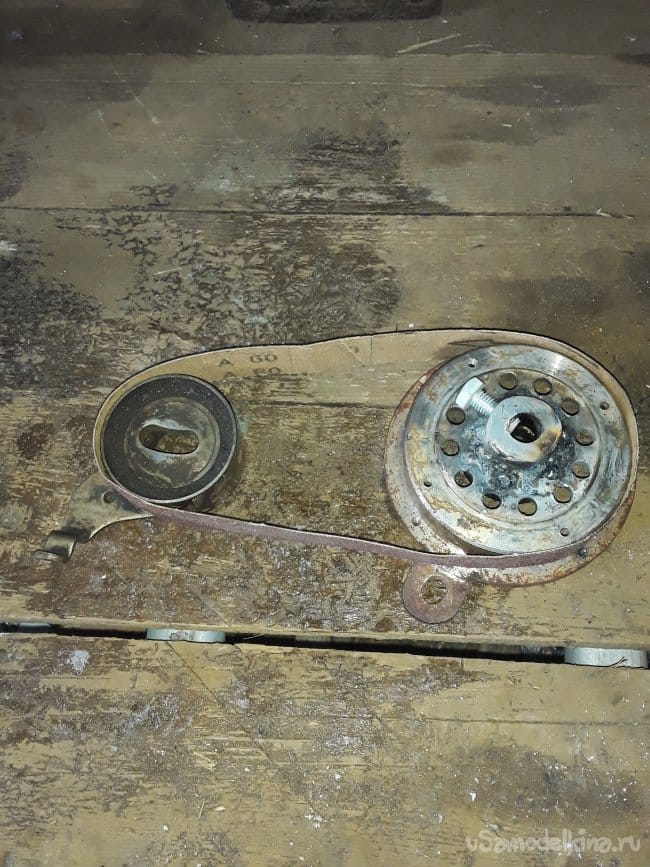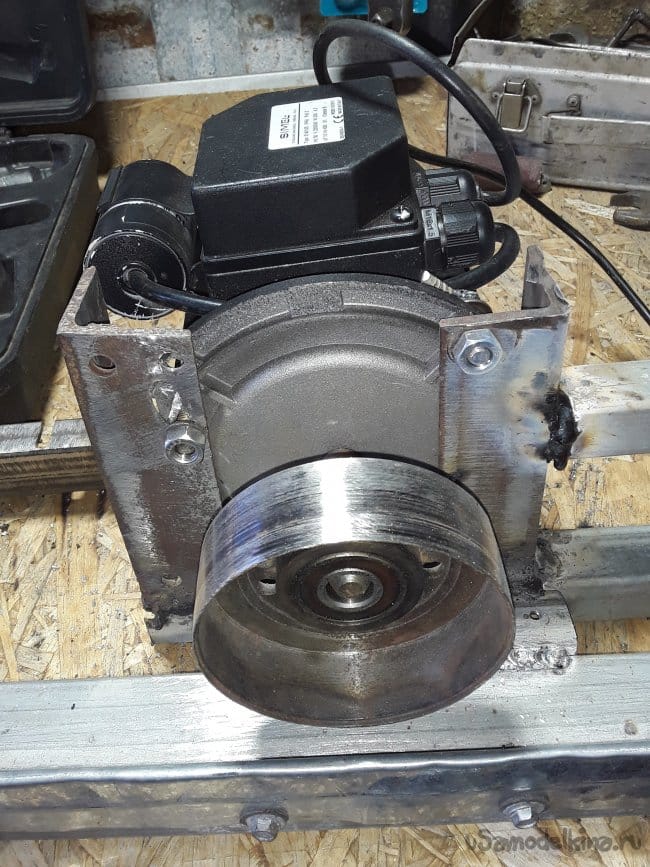 Ну все хватит болтать я приступаю к работе. В мастерской нашел два куска уголка 50 на 50 мм пару кусков профильной трубы старый натяжной ролик от иномарки и поехал на барахолку искать двигатель. Нашел подходящий двигатель не знаю от чего, но он 300 Вт и крутит 1100 оборотов думаю сойдёт купил его за 700 рублей и отправился мастерить.