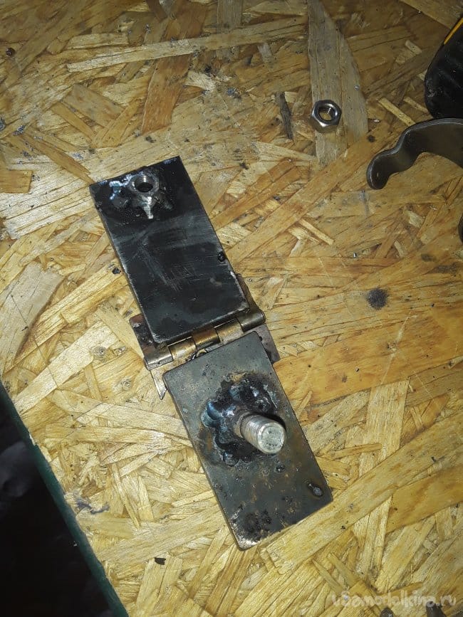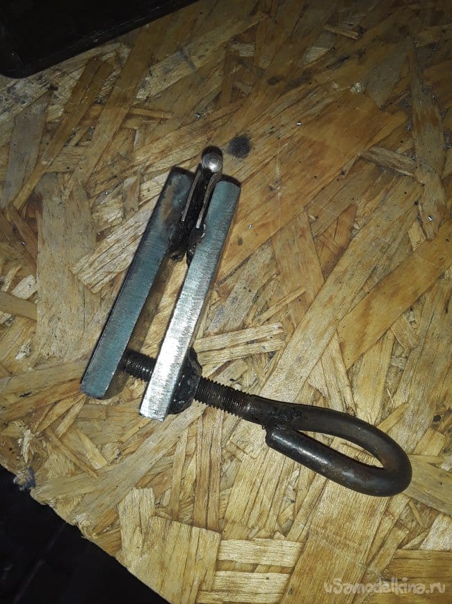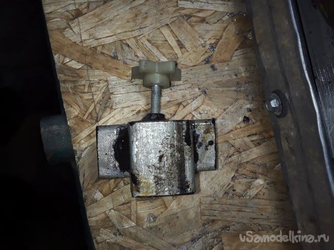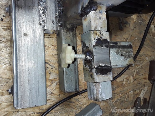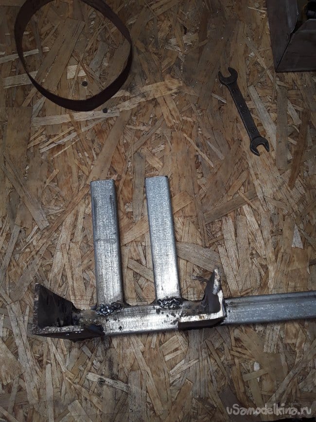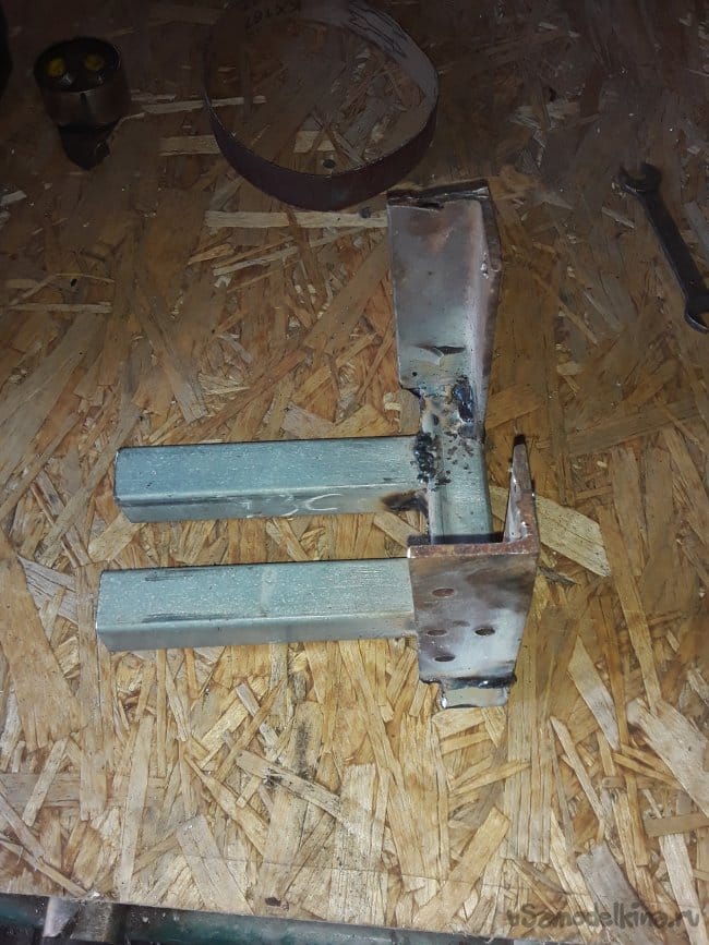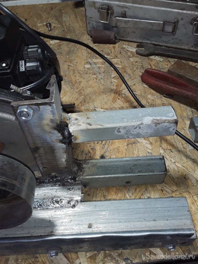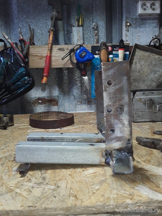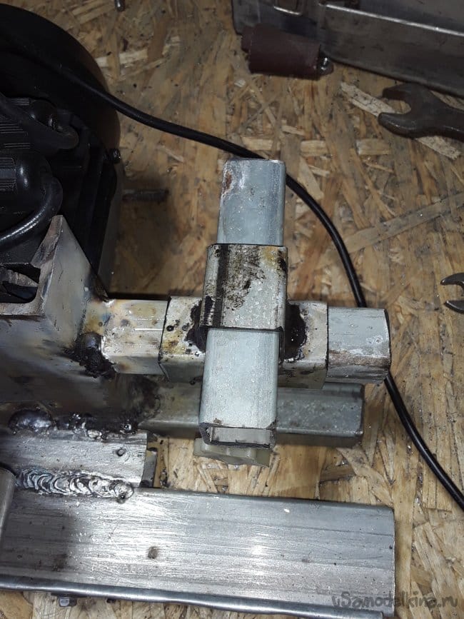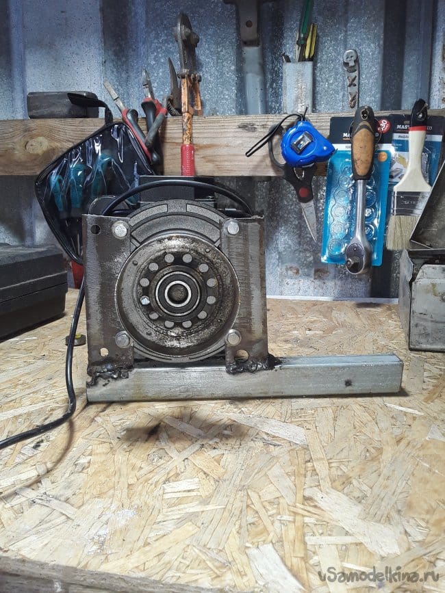 Для рамы взял два отрезка профильной трубы 30 на 30мм по 12 см и основной профиль 25 см. Приварил к основному профилю два отрезка немного отступив от края между отрезками 8 см приварил их немного под углом и чтобы станина стаяла устойчиво приварил кусок проволоки на края. Для крепления двигателя взял два куска уголка 50 на 50 мм просверлил 4 отверстия и прикрутил на двигатель затем выставил на свое место на станине и приварил электро сваркой. На кожухе двигатель по краям и снизу немного срезал для того чтобы при регулировке ничего не мешало. В уголке в левом краю сделал распил для того чтобы двигатель водил верх и вниз для регулировки толщены шлифовки так будет надежнее. Двигатель держится на двух болтах правый болт только притягивает двигатель, а левый болт уже и производит регулировку. В сети обычно просто основную станину закрепляют в сквозную на болт, а другой край выставляется на нужную высоту и затягивается. Мне же так не нравится не знаю почему по этому сделал так как проверено.