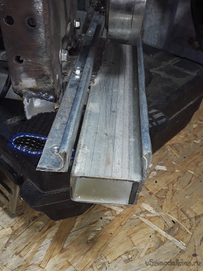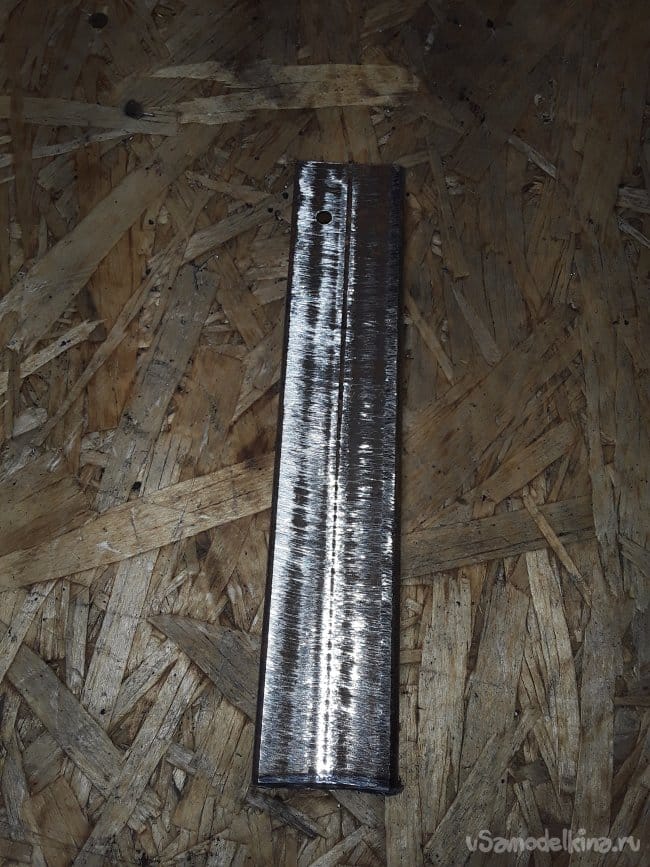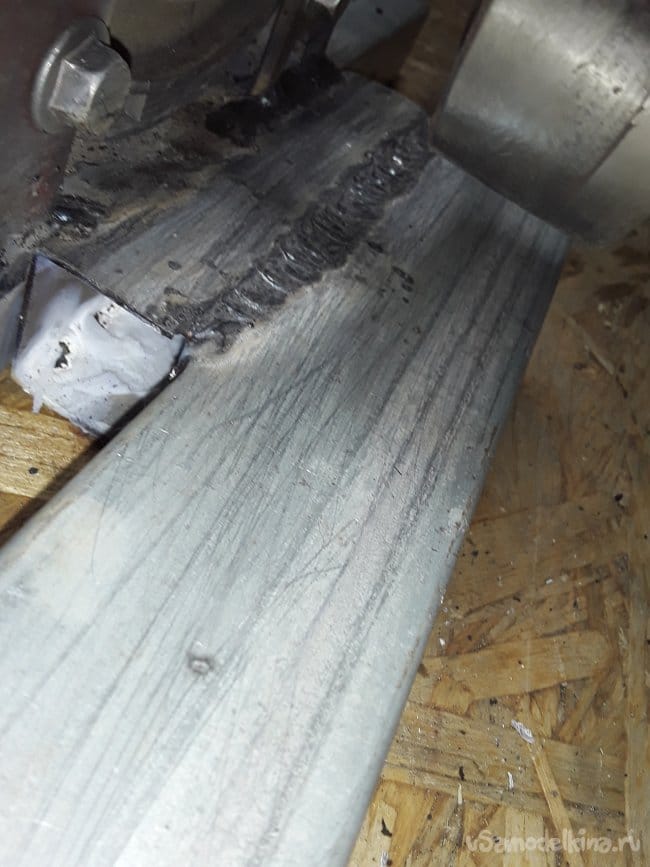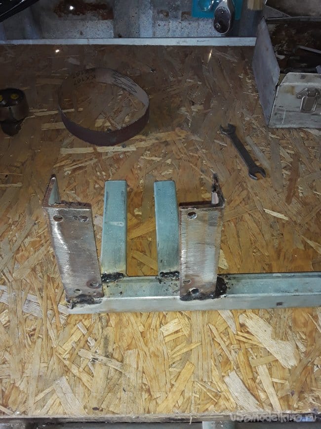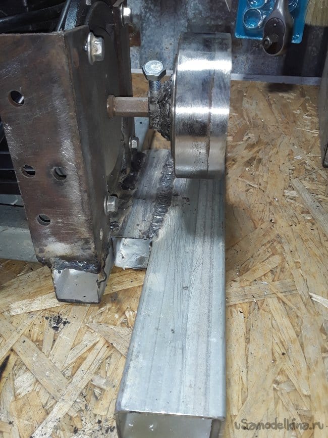 Для того места где будет ходить салазках к профилю привариваю кусок профиля 30 на 30 мм 12 см, а потом сбоку привариваю профиль 30 на 50 лежа по нему будет ходить салазкам. Длину разделён поровну чтобы с обеих сторон было одинаково. Для того чтобы было удобно по бокам прикручиваю два куска подходящей железки высотой 20 мм. Левую потом открутил она не нужна оставил только правую. Вот и все осталось малость ставлю ведущий шкив на место так, чтобы его край не заходил за край ограничителя. Ролик шириной 3 см так как шире ножи я не делаю да и экономия ленты, так как лента изначально 10 см шириной из одной можно сделать три. Хотя изначально хотел сделать ролик шириной 5 см, но при работе увидел что лента изнашивается на половину и я выбрасываю ленту на половину стертую.