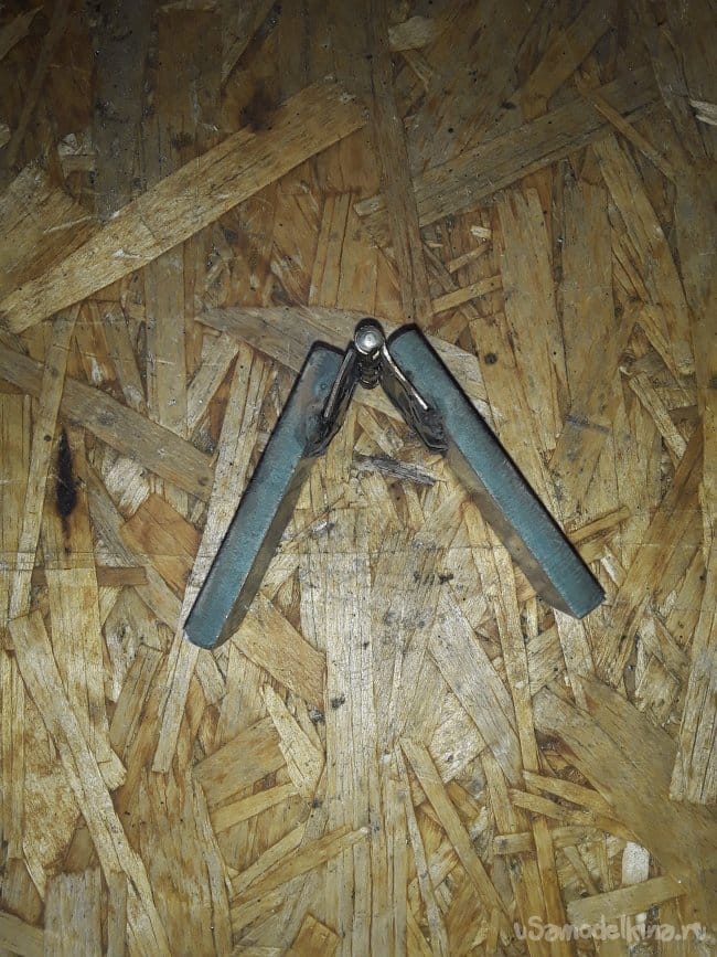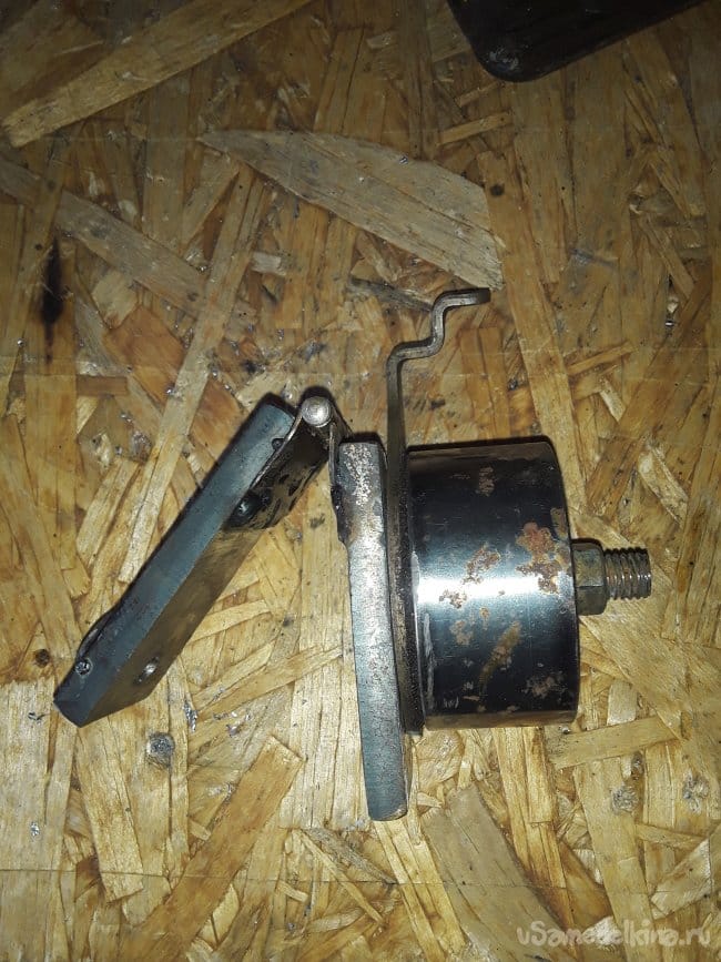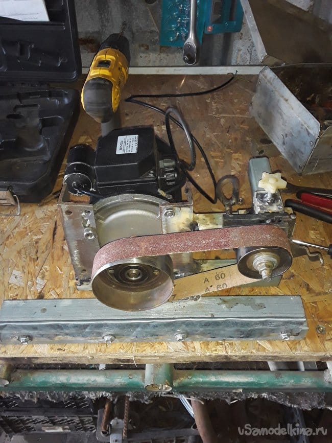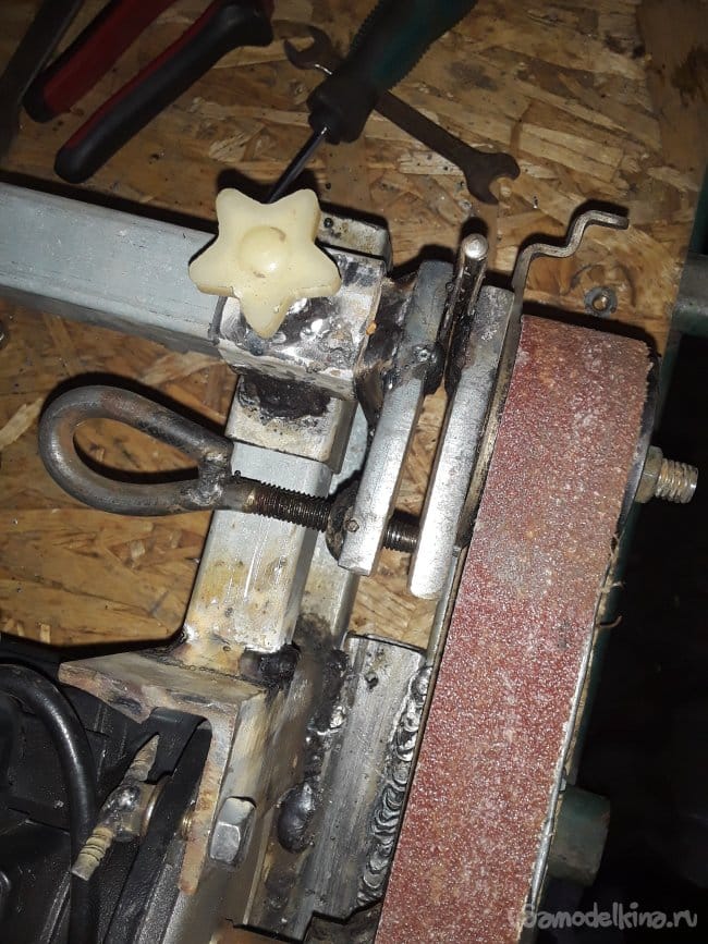 Для крепления натяжного ролика взял две пластины 8 мм толщиной 7 см длиной и 5 см шириной для того чтобы можно было менять угол наклона привариваю на края навес не знаю откуда он, но он подошел как надо. Для самого ролика в центре пластины приварил болт 10 мм через шайбу затянул все. С обратной стороны на краю пластины просверлил отверстие 8 мм и приварил гайку. Из проволоки согнул ключик и нарезал резьбу им я могу регулировать угол чтобы лента не убегала. Для крепления этого всего с обратной стороны привариваю профиль 30 на 30 мм и все механизм натяжного ролика готов все примеряю на свои места все протягиваю как надо. Ставлю ленту, запускаю и все работает как надо один минус - это то, что искры летят куда не надо, но это мелочи немного доработаю потом потому что двигатель крутит по часовой стрелке если я сделаю вращения против часовой стрелки да искры не будут лететь, но при работе острее или край заготовки может попасть на стык там где лента склеивалась и тогда травмы будут точно ну как-то так немного поработал, посмотрел что еще сделать мелочи доделал. После работы убедился что все устраивает разбирать все, шлифую и крашу.