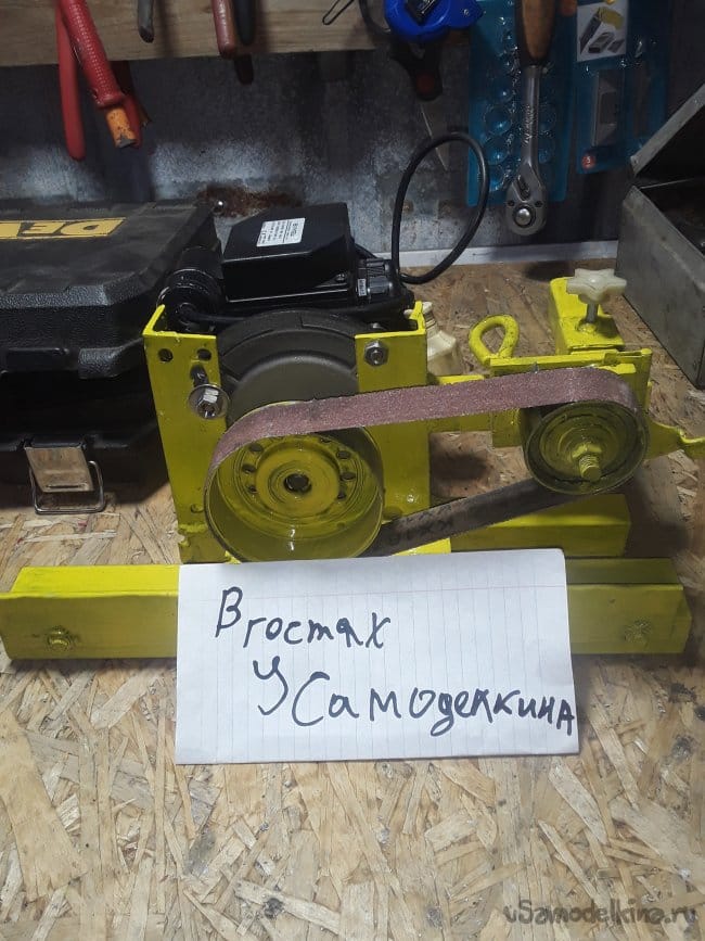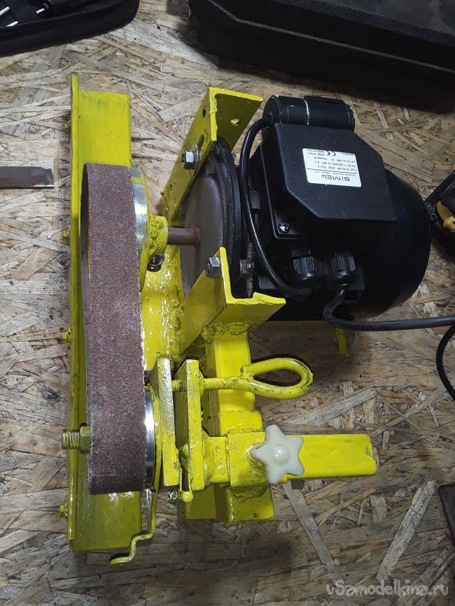 Ну вот и все разобрал, почистил, покрасил и заново собрал. Такой гриндер прослужит не один километр лент на нем можно шлифовать плоскость и выводить линзовидные спуски. Можно приделать столик и шлифовать как на основном Грин дере. Также жирный плюс это экономия ленты и работа с разным диаметром. По затратам у меня только покупка двигателя, а так все остальное было под рукой. Конечно можно было собрать и по лучше, но мне много не надо главное чтобы на нем можно было легко и быстро работать и все. В конце статьи оставил видео всех работ не судите строго, а лучше помогите советом обычному работяге, а не учить уму о покраске и сварки сидя на диване. Творческого человека может обидеть каждый. Спасибо вам друзья за ваше драгоценное внимание. Ну а вам диванные эксперты ловите очередную работенку. До новых встреч в гостях У Самоделкина
