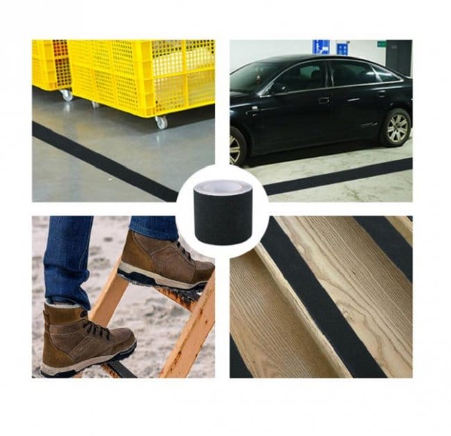 Подобная лента предназначена для оклеивания ступеней лестниц, пандусов, напольных покрытий, всевозможного спортивного оборудования, а также иных поверхностей, на которых можно легко поскользнуться. Основа ленты изготовлена из поливинилхлорида (ПВХ), покрытие — из песка кремнезема (тип песка, который в основном состоит из крошечных гранул кварца), а это означает, что по своей структуре покрытие это похоже на наждачную бумагу с зернистостью примерно в 80 грит и потому для оклеивания рукояток разнообразного инструмента или инвентаря подобная лента скорее всего не подойдет. Обратная сторона ленты обработана клеевым составом достаточно высокого качества, за счет чего обеспечивается надежная фиксация абразива не требуемой поверхности, кроме того, ленту можно с одинаковым успехом наклеивать как на полностью гладкое, так и на шероховатое покрытие. Отметим также, что лента характеризуется высокой устойчивостью к воздействию влаги и потому представленный материал прекрасно подходит для использования в условиях улицы.