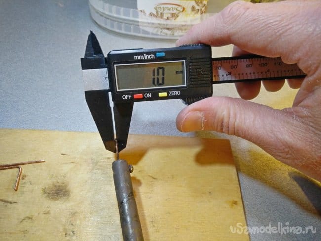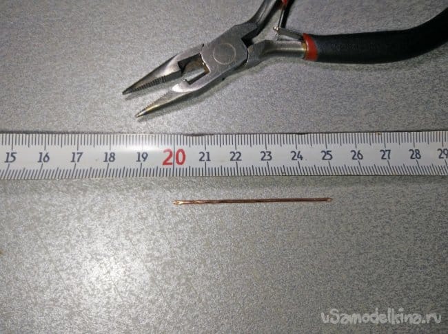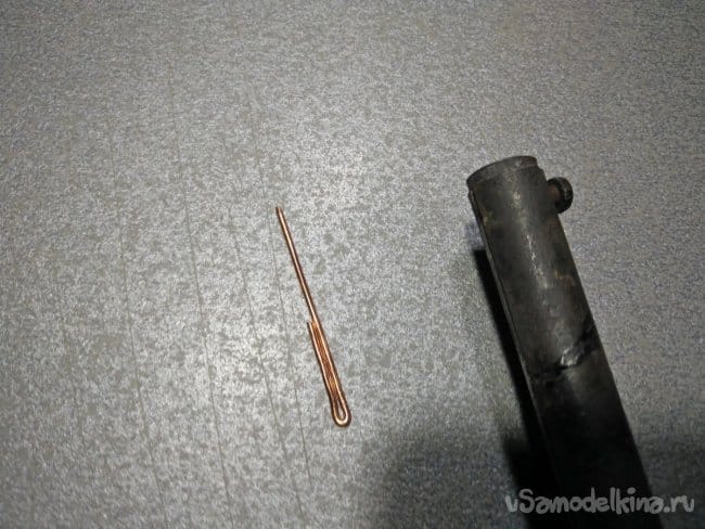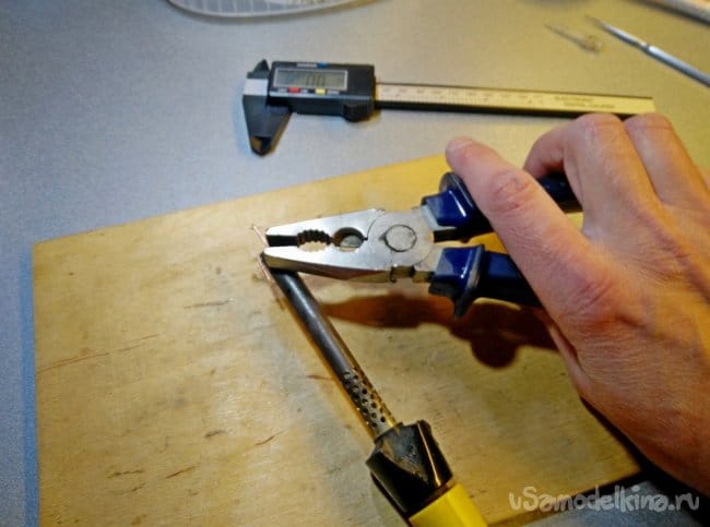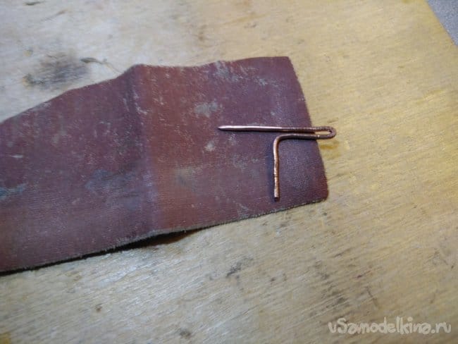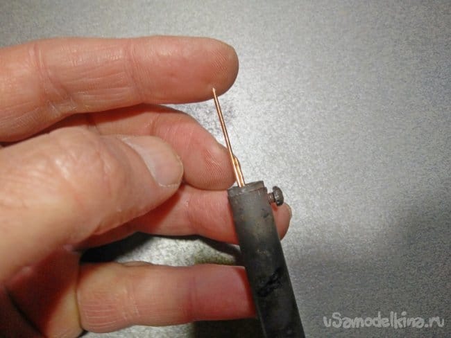 Далее, согнуть провод таким образом, чтобы он помещался в паяльнике. После этого, на наждачной бумаге, надо его заточить чтобы он был острым и легко прокалывал пластмассу.