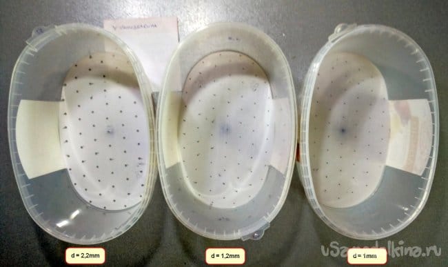 Не зная какой диаметр лучше всего подойдёт для моих семян, я начал экспериментировать с разными отверстиями. Как видно на фото, диаметр в 2, 2 мм оказался слишком большим.