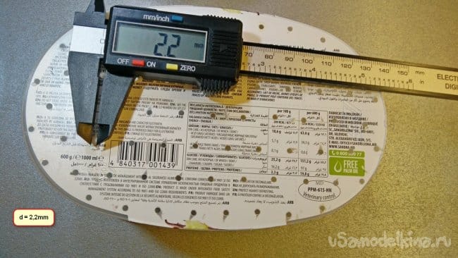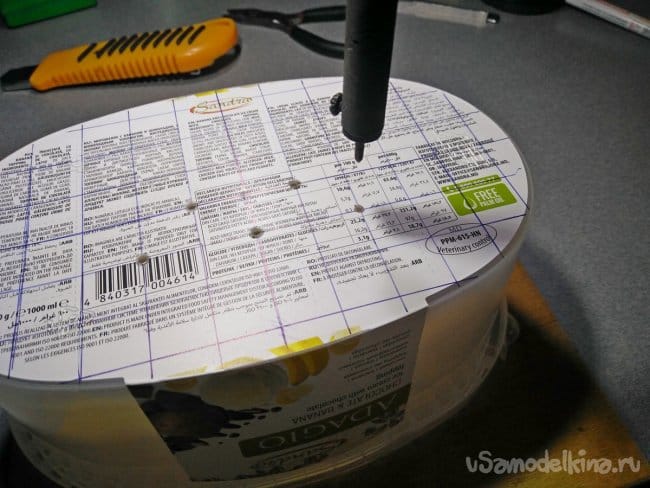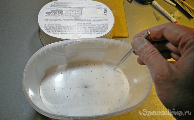 После того как мы прочертили обратную сторону контейнера для сеялки, с помощью шила протыкаем намеченные отверстия. Можно обойтись и без него, с помощью прогретого паяльника, делать отверстия сразу же в пластик.