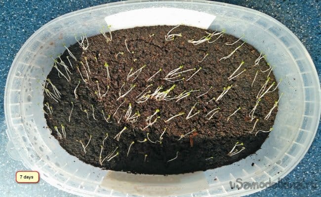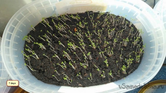 Как видно на фотографиях, на седьмой день после посадки семян, результат очевиден. Количество семян высаженных в грунт проросли гораздо лучше, чем тех что были посажены на бумаге. Помимо этого, с бумагой оказалось сложнее работать из-за того что она в процессе деформировалась или прилипала.