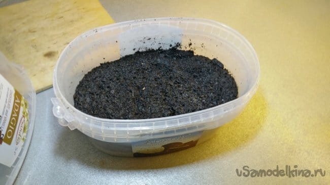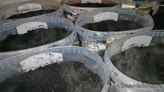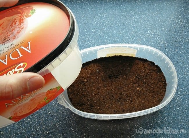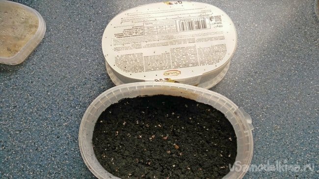 Можно также смешать огородную землю со своего участка, с магазинной. Дополнительно добавив в неё и другие компоненты такие как песок и торф. Эти пропорции зависят от растений которые вы будете выращивать на рассаду. Я испытывал разные методы приготовление земли для этих целей. В конце концов остановился на покупном, специальном грунте для рассады. Далее, землю высыпают в контейнер и немного утрамбовывают её, с помощью другого такого же контейнера.