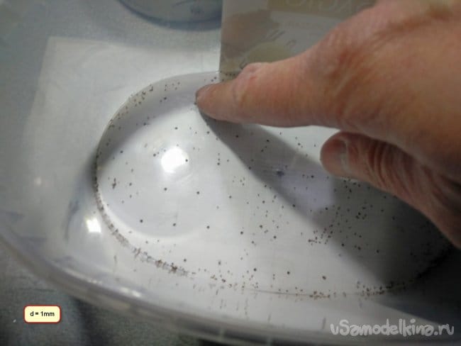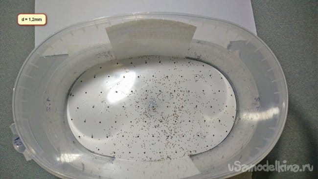 На фото видно испытания с диаметром отверстий в 1 мм. Для таких мелких семян результат посадки неплохой. Видно, что с таким диаметром просачиваются через отверстие несколько семян, 2 - 3 штуки. Но бывает что, заходит и по одному семя за раз. Поэтому я остановился на диаметре в 1,2 мм.