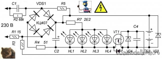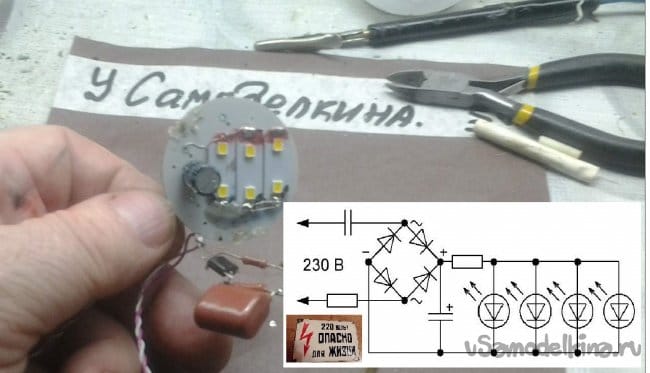 Типовая схема, только светодиоды включены не последовательно, а параллельно, естественно, емкость гасящего конденсатора для увеличения отдаваемого тока должна быть больше. (Планка со светодиодами взята из светильника, где они стоят по 4 шт. параллельно в штатном заводском включении. Разброс их параметров, скорее всего, минимален. Реально светодиодов установлено 6 штук.)