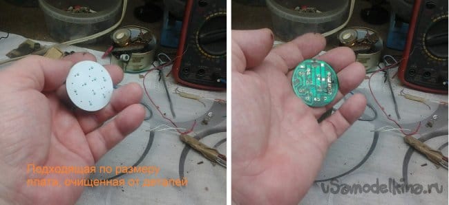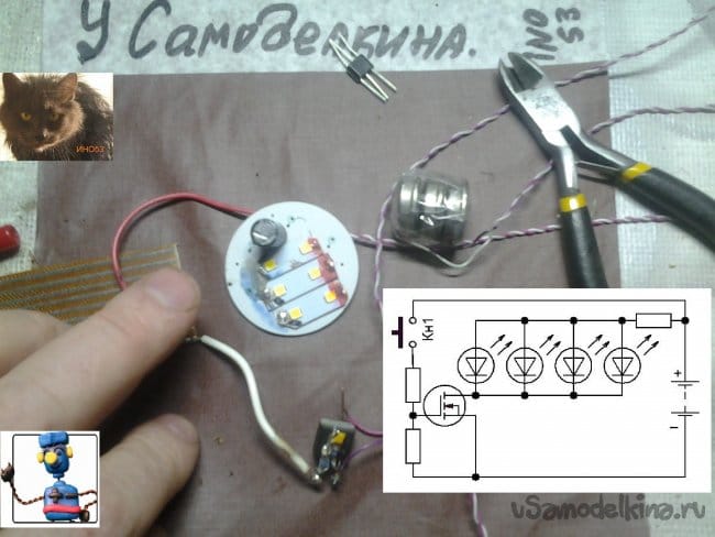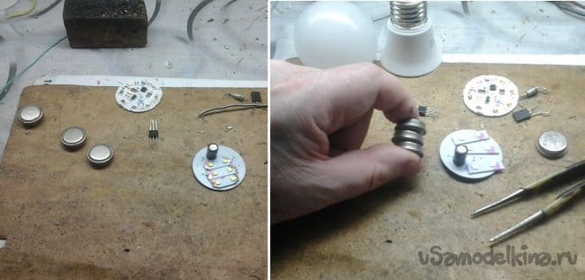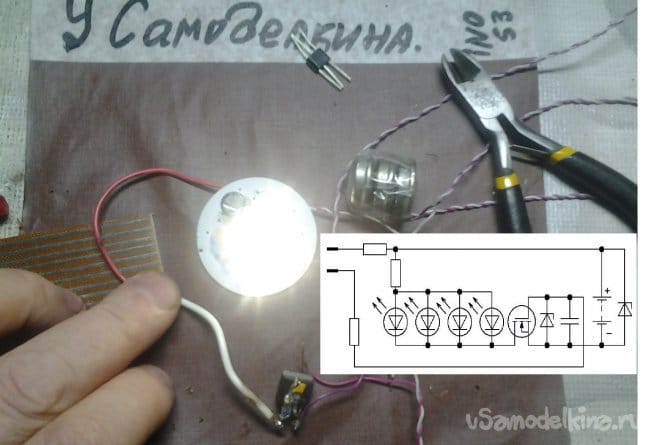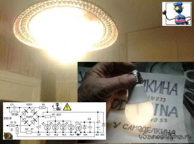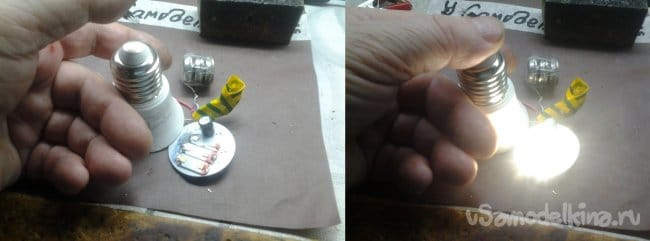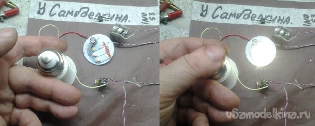 Он выбирает подходящий транс, лампочка гаснет, отдаю ему – на, заверни на место. Глаза у него по шесть копеек, тремя пальцами аккуратненько берет лампочку, заворачивает, щелкает выключателем – загорелась! Пытается спросить: А как это?... Бесцеремонно выгоняю – Вали, у меня суп стынет! Вечером несколько звонков от бывших учеников, серьезных ребят, спецов-электронщиков – что там этот балбес опять выдумал? Всех обзвонил… Посмеявшись, назначаем сбор как обычно, на День радио. Так в чем же суть? Светодиодная лампочка, с виду обычная, и светит в патроне как обычная, но и в руках загорается в нужный момент как фонарик.