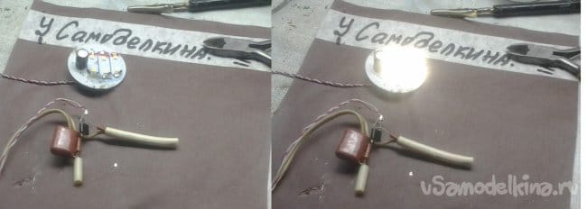 Одеваем колпак, видна тень от конденсатора. Что делать, внутри корпуса места не хватает… Много места заняли детали сетевого драйвера, фото внизу, вот здесь он на проверке, еще не изолированный.