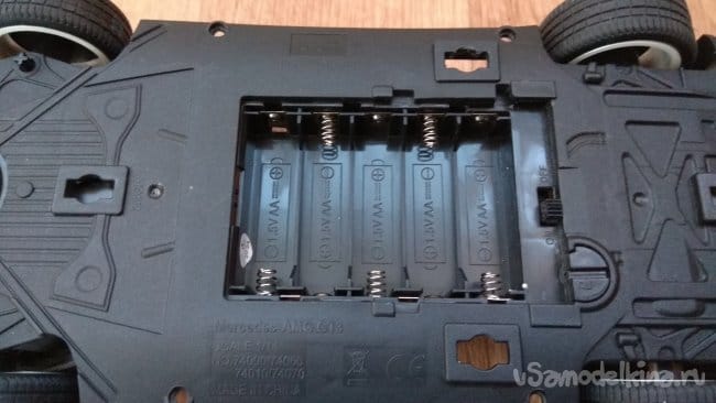 Первоначально рассматривался вариант просто переделать машинку на работу от аккумуляторов. Для работы электроники используются 5 батареек формата АА, в сумме это дает 7,5В.