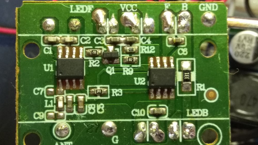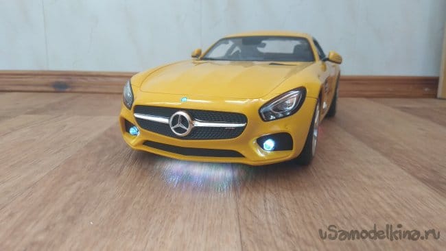 Во время включения питания машинка моргает передними фарами и задними фонарями, пока не нажать на кнопки пульта. После этого фары и фонари гаснут и зажигаются соответственно во время движения вперед или назад. Если машинка не двигается и подсветка выключена, не понятно, включено питание или нет. На DC-DC преобразователе есть светодиод индикации работы, но он светит тускло и находится внутри корпуса. Пришла идея установить светодиодные противотуманки. Заодно они добавят света при езде в темное время суток.
