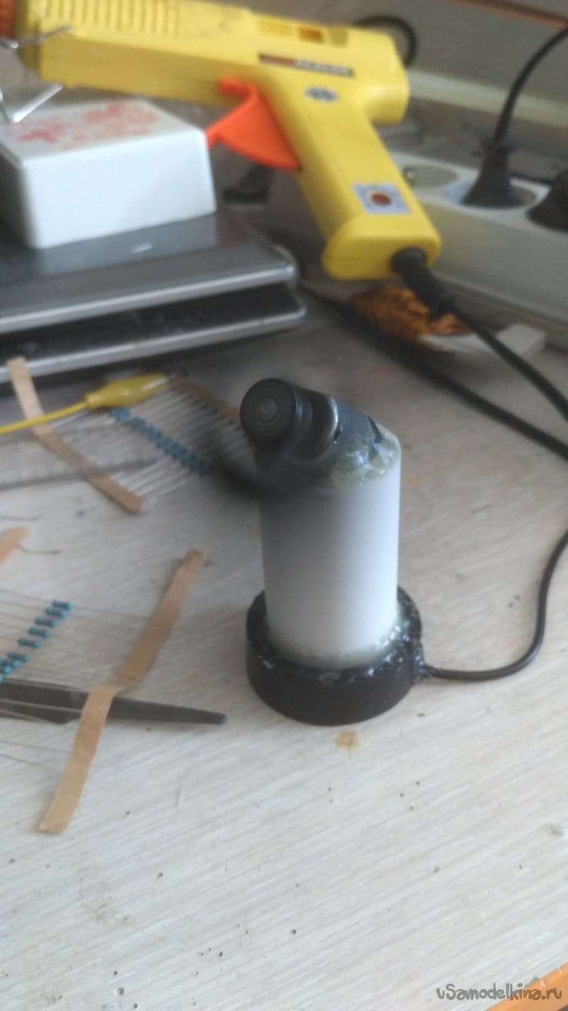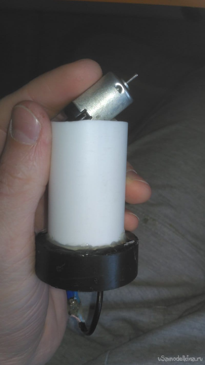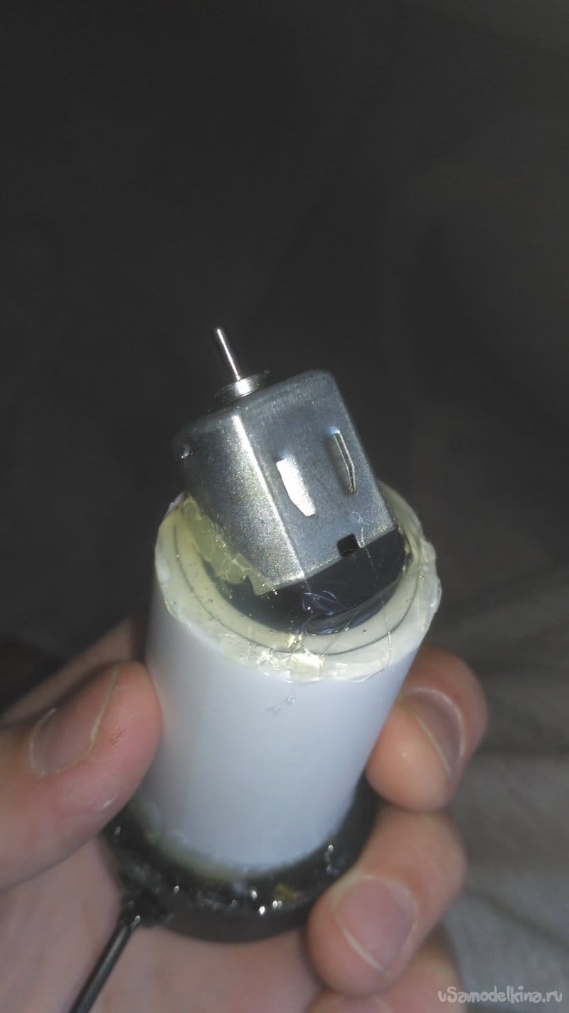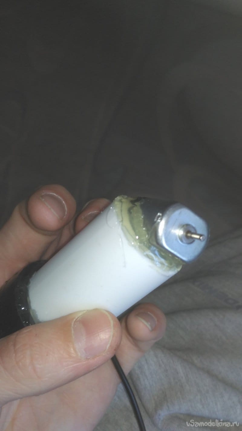 Закрепляем его в таком положении термоклеем, и тут его понадобится много. Потребуется плотно «влить» моторчик в трубу. Но приклеивать нужно аккуратно, чтобы не случайно не залить клей внутрь мотора или не заблокировать вал.