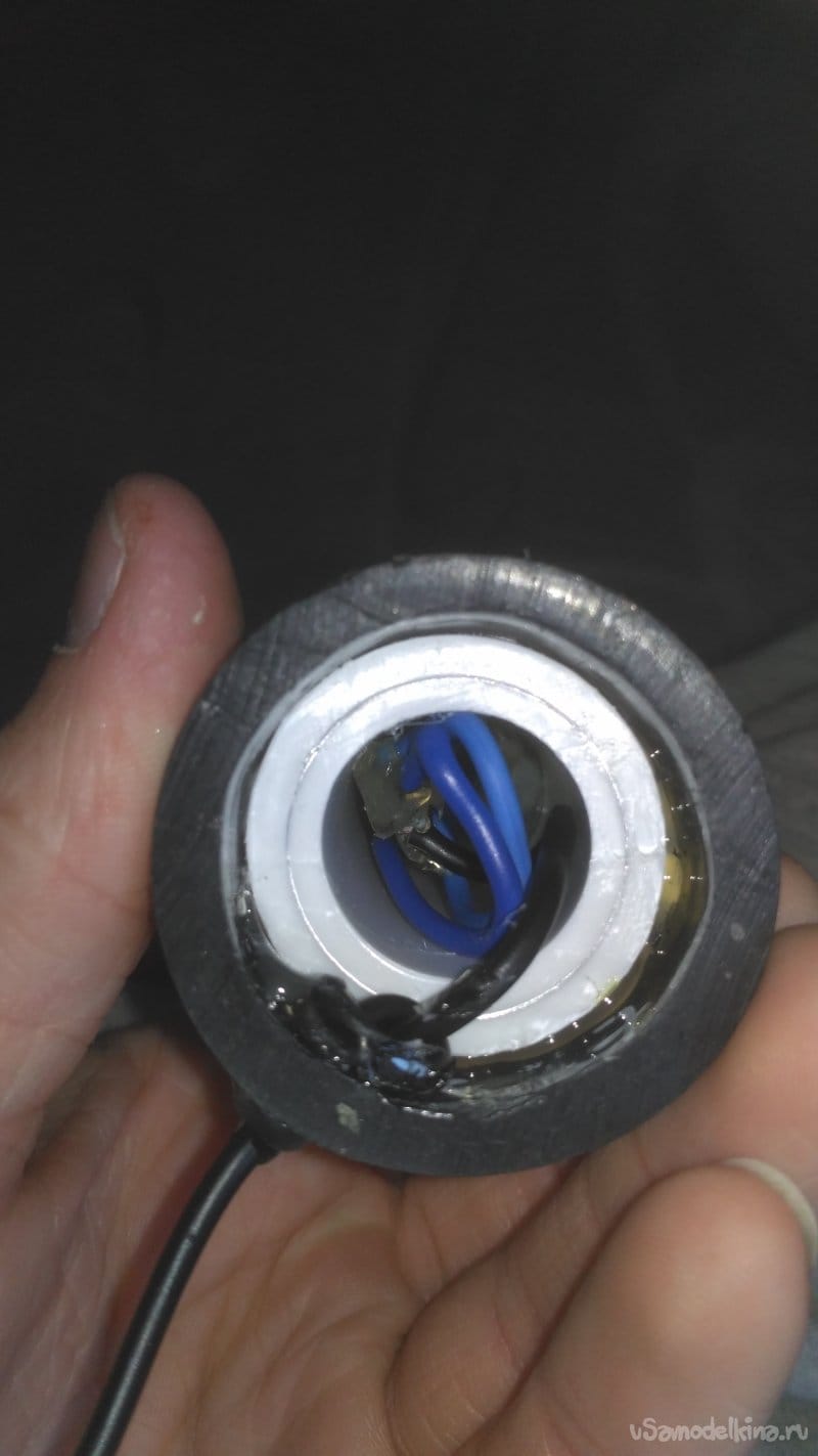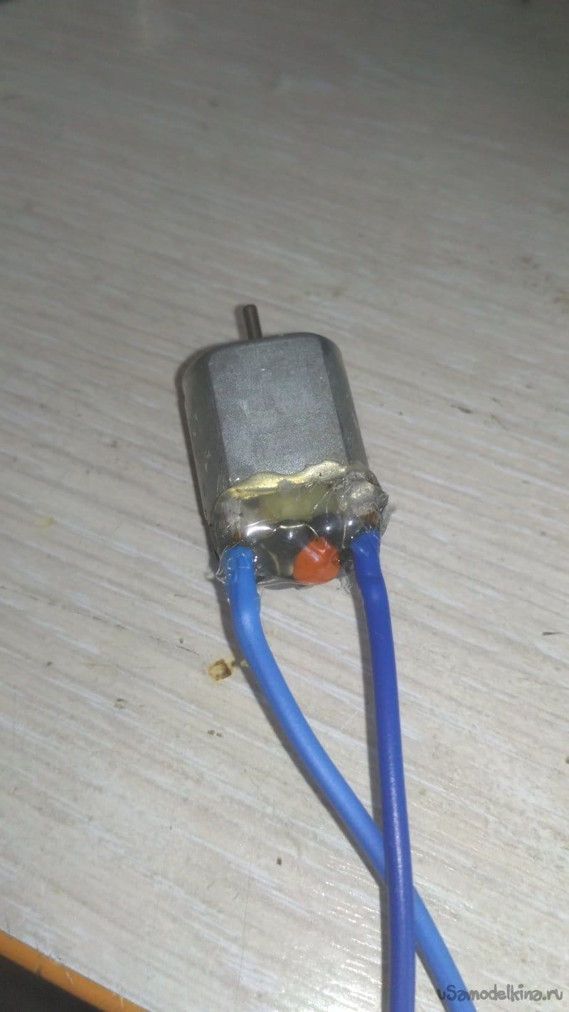 После пайки плотно заливаем термоклеем во избежание повреждения контактов мотора.