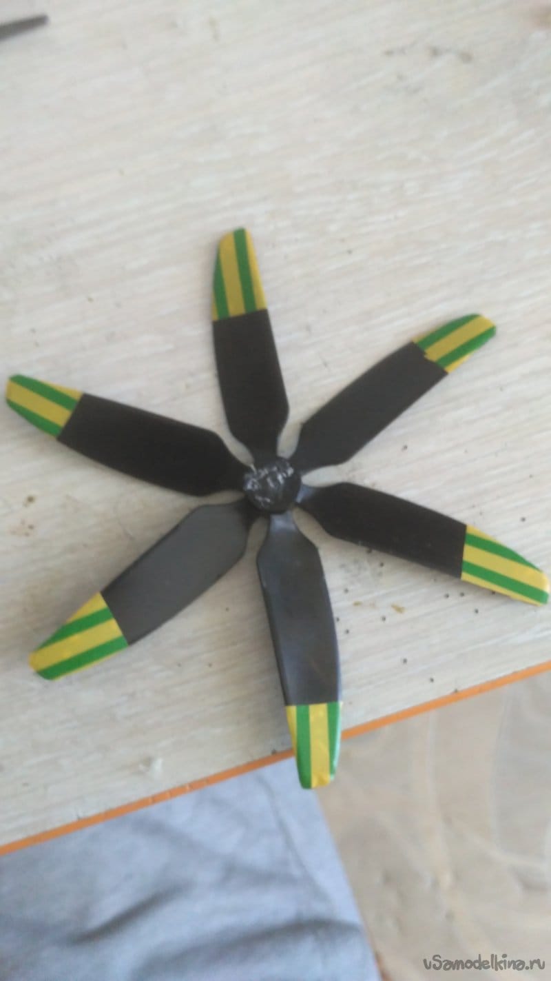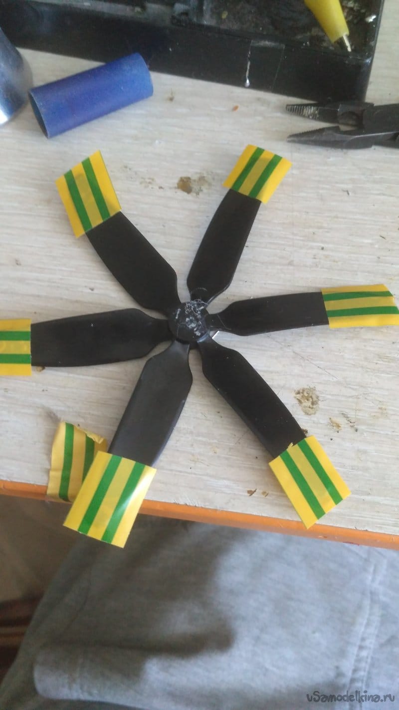 Решение третьей проблемы я подсмотрел в авиации. Там края пропеллеров красят в яркий цвет, так почему бы и нам не повторить их приём. На каждую лопасть приклеиваем кусочек изоленты яркого цвета.