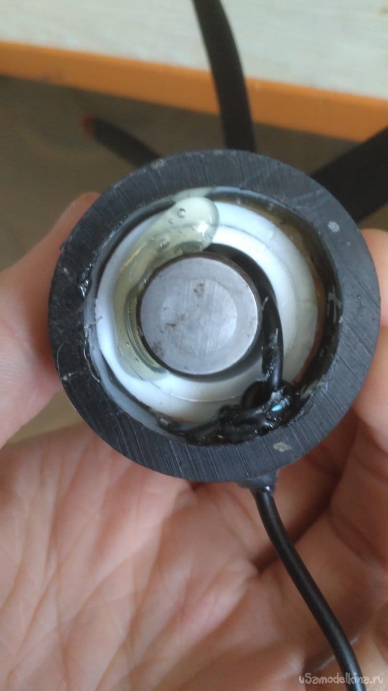 В дно вентилятора вклеиваем что-нибудь тяжёлое. Я использовал цилиндр из тракторного подшипника.