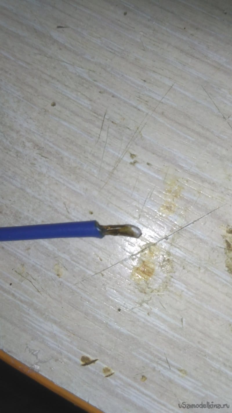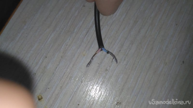 И только теперь переходим к монтажу проводу подключения. Прежде всего, его нужно просунуть в отверстие и зафиксировать изнутри, завязав узел. Для большей прочности дополнительно заливаем узел и место стыка его и каркаса клеем. Обязательно ждём его полного застывания. Аккуратно снимаем общую изоляцию. Под ней у меня было всего два провода, что и следовало ожидать от дешевейшего китайского кабеля. У вас может оказаться не два, а четыре (в очень редком случае пять) провода. Их расцветка может оказаться очень разной, поэтому определить нужные на глазок не получится. Но для таких случаев существует мультиметр, а если и его нет, то можно использовать этот же моторчик в качестве активной нагрузки: используйте разные комбинации подключения, их всего лишь восемь. Потом вам останется подобрать нужную полярность подключения мотора: она определяет направление вращения вала. После того, как вы нашли все необходимые характеристики из вышеперечисленных, высвобождаем от изоляции два необходимые нам провода и качественно пролуживаем их.