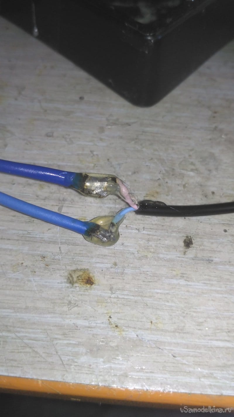 В первую очередь припаиваем к мотору соединительные провода, предварительно тщательно их залудив. Лучше взять провода потолще, чтобы исключить возможность их случайного повреждения. Я использовал многожильные медные провода из провода питания неизвестного прибора.