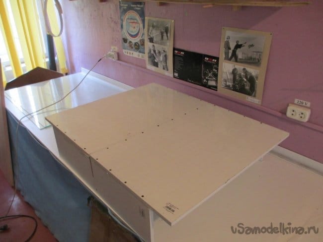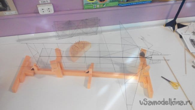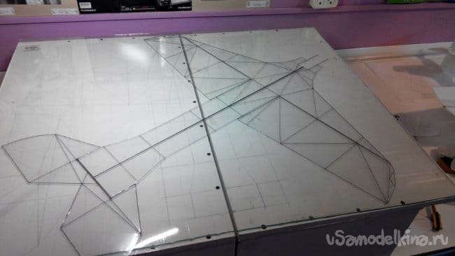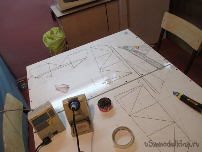 Для изготовления каркаса модели изготовлен специальный стенд, позволяющий работать в трех плоскостях. Куплено несколько мебельных щитов нужного размера. Одна половина столешницы снимается во время работы с вертикальной плоскостью фюзеляжа. Горизонтальные плоскости оклеены скотчем, как защита от клея. Прямо на ней расчерчен контур самолетика.