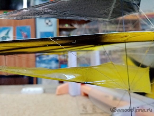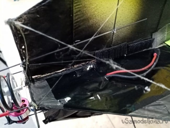 В размер установил новую мотораму из угольного прутка в 1 мм. Заклеил все на циакрин и провязал все соединения арамидной ниткой. При установке моторамы порвал в нескольких местах ультратонкую пленку. Но лететь очень хотелось, поэтому временно заклеил отверстия черным скотчем. После капитально отремонтирую. Добавил несколько усиливающих растяжек.