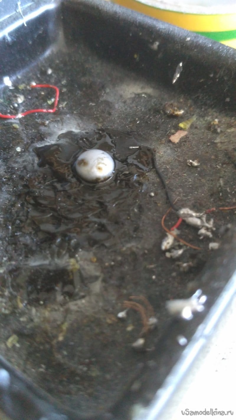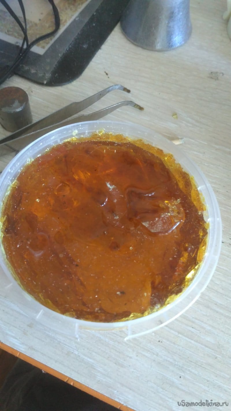 И теперь возникает вопрос, как извлечь шарик металла из твёрдой смолы? Это не так сложно, достаточно расплавить смолу рядом с шариком и как можно быстрее пинцетом зацепить и вытащить его из полужидкой смолы.