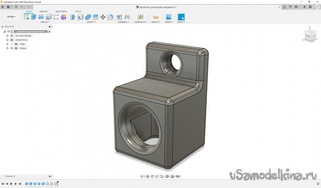 Крышка будет держаться благодаря системе двух неподвижных блоков и противовесу. Для начала сделаем сами блоки. Я решил напечатать их на 3D принтере. И за 15 минут смоделировал два куба с крупными отверстиями снизу и сбоку. Большие отверстия я сделал, так как планировал использовать толстую веревку для красоты. Но потом передумал. Вместо напечатанных деталей можно использовать обычные металлические уголки, но есть риск перетирания веревки.