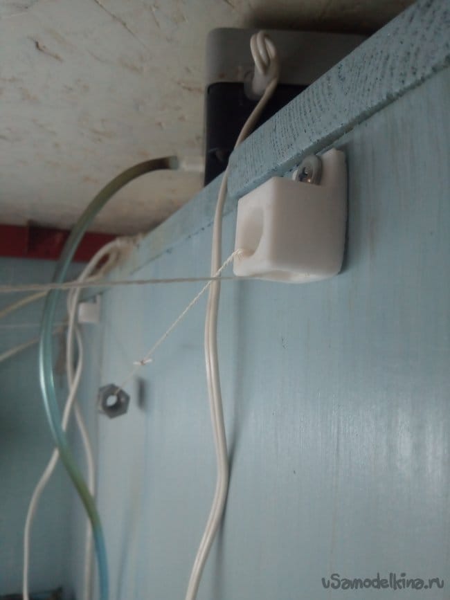Теперь привязываем к концу веревки ограничитель, это может быть скрепка, гайка или как в моем случае маленькая шайба. Главное, чтобы он не пролазил в отверстие в крышки аквариума. Далее продеваем веревку точно так же, как в инструкции выше. После того как продели, на втором конце веревки привязываем еще один ограничитель.