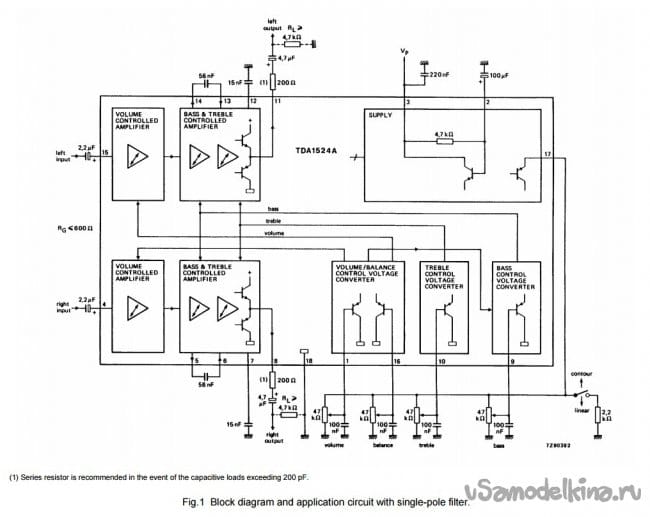 Темброблок собран на популярной TDA1524A. Из регуляторов я использовал только громкость и тембр. Вместо ненужного мне регулятора баланса поставил делитель из двух резисторов.