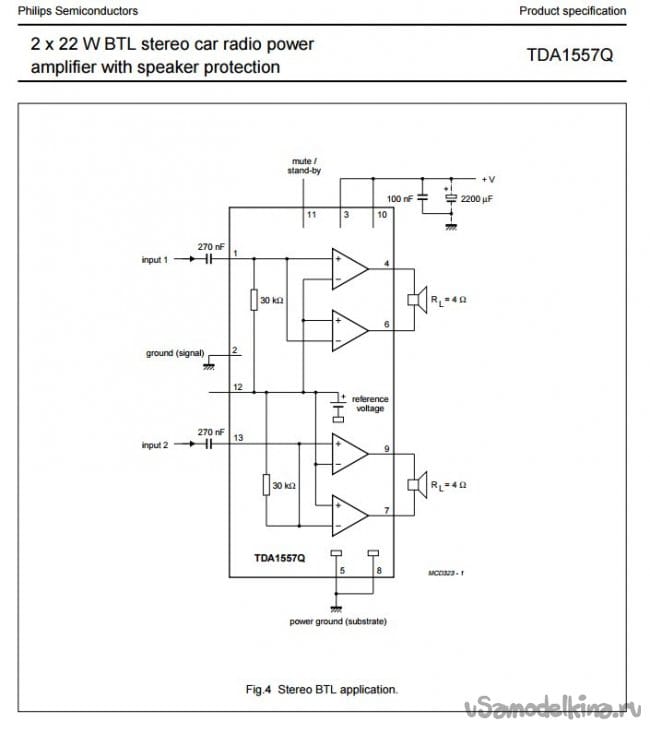 Усилитель мощности собран на популярной TDA1557Q и способен при однополярном питании 14,4В (мин. 6В, макс 18В) выдать 22Вт (17Вт чистого звука при коэффициенте нелинейных искажений THD до 0,5%) на два канала благодаря мостовой схеме. Этого более чем достаточно для повседневного проигрывания музыки.