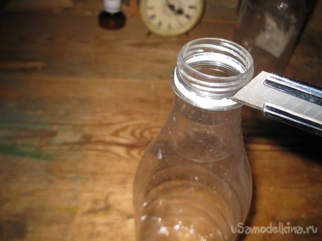 Шаг 2. При помощи строительного ножа, срезаем с горлышка бутылки стопорное пластиковое кольцо, чтобы оно не мешало нам в будущем.