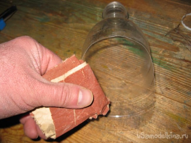 Шаг 3. При помощи мелкозернистой наждачной бумаги, притупляем острые кромки среза корпуса пластиковой бутылки.