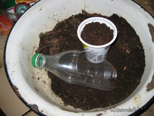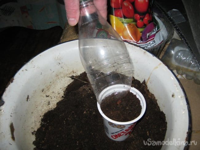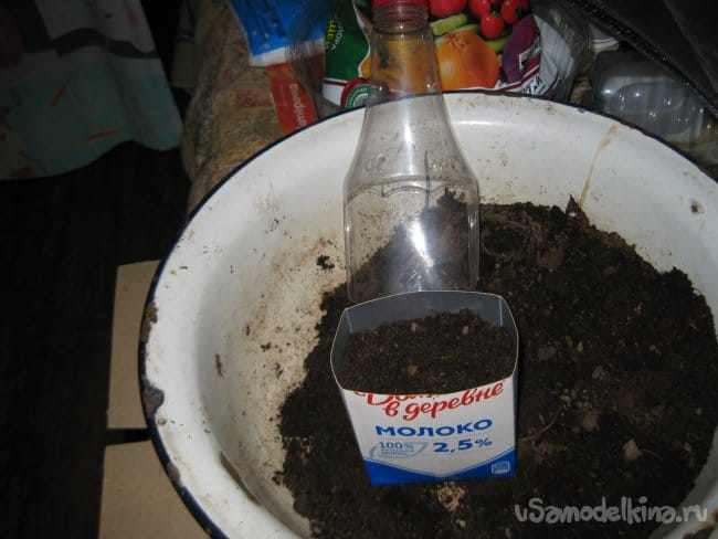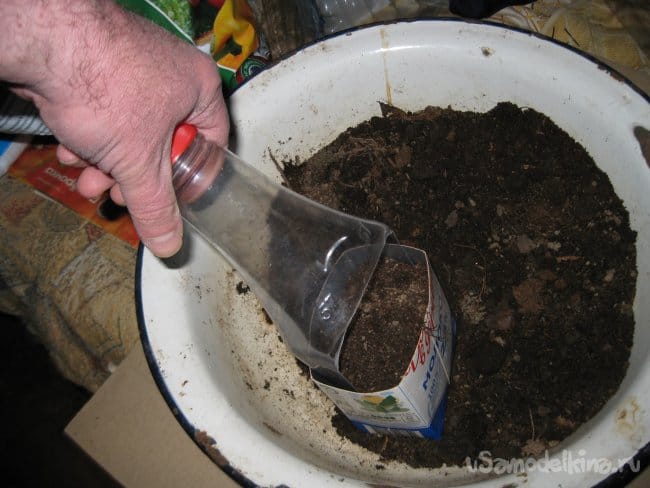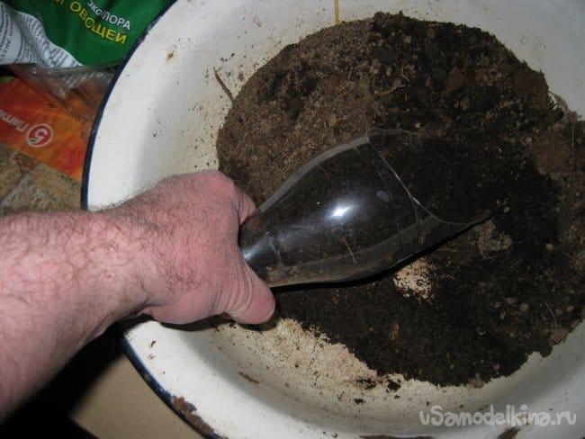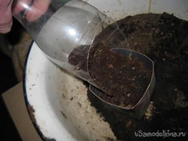 Точно так же, за один раз, насыпаем этим совком грунт и в круглый контейнер.