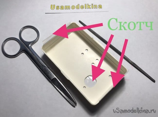 Для хорошего прилегания к мыльнице, скотч нужно аккуратно, от центра в разные стороны, пригладить пальцами. Делать это нужно без особых усилий, чтобы в скотче не образовались складки. Обрезанные с «припуском» оставшиеся концы скотча аккуратно загибаются внутрь крышки и прижимаются (приклеиваются).