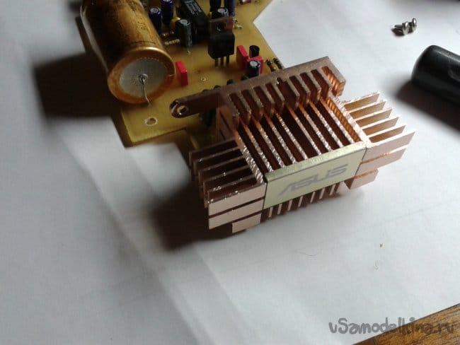 Я измерил и посчитал площадь родного радиатора, подобрал из имеющихся запасов красивый радиатор от материнской платы ASUS.