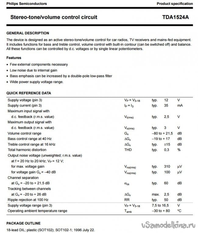 Что хорошо было для музыкального центра, то и для простого усилителя будет хорошо, решил я. Для полноты конструкции добавил хорошо известную мне микросхему электронного регулятора громкости, баланса и тембра TDA1524A которую увидел много лет назад в прекрасной книге П.Шкритек «Справочное руководство по звуковой схемотехнике».