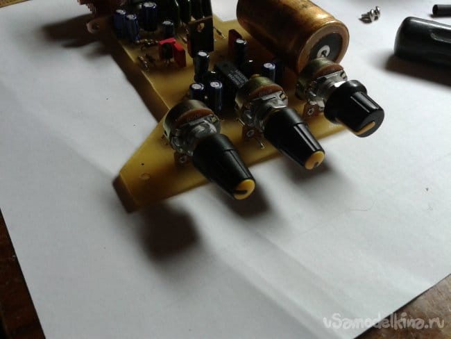 Ручки для регуляторов покупал разные, чтобы выделить тембр и регулятор громкости, но оказалось, что конические ручки очень неудобно крутить, да и дизайн был не очень, поэтому в окончательном варианте ручки все одинаковые большие.