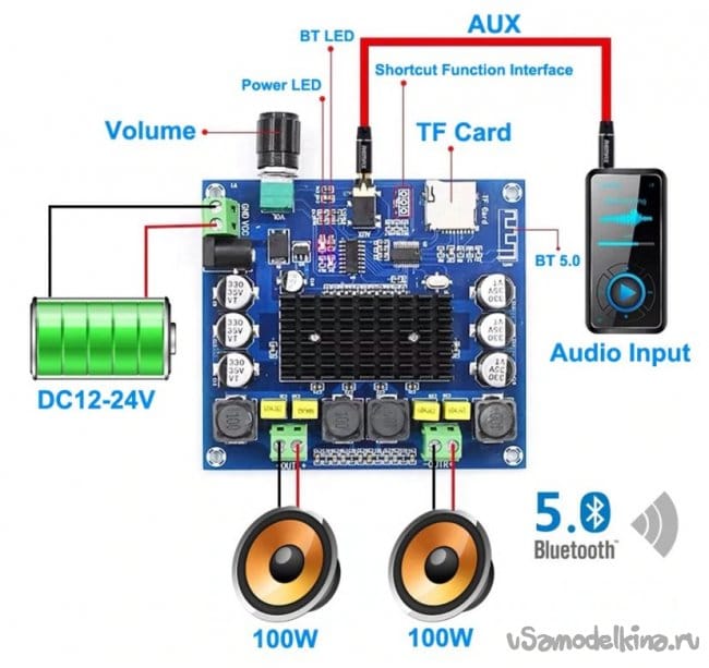 1 фонит от модуля блютус , 2 нет смысла собирать такую херню , не целесообразно экономически и уши режет . Той транс стоит в 10 раз дороже чем все остальное . Заходим на али  и смотрим усилитель 2,1 TDa 3116D 2 уже готовый 50+50+100 . И в 2 раз дешевле твоей самоделки. !!!