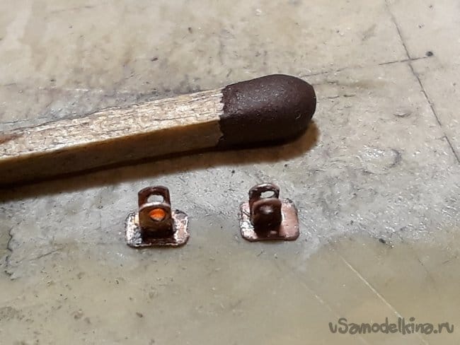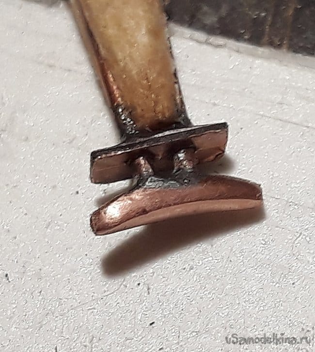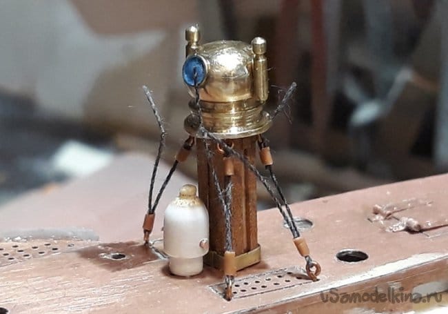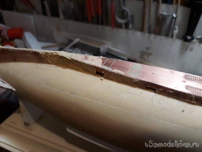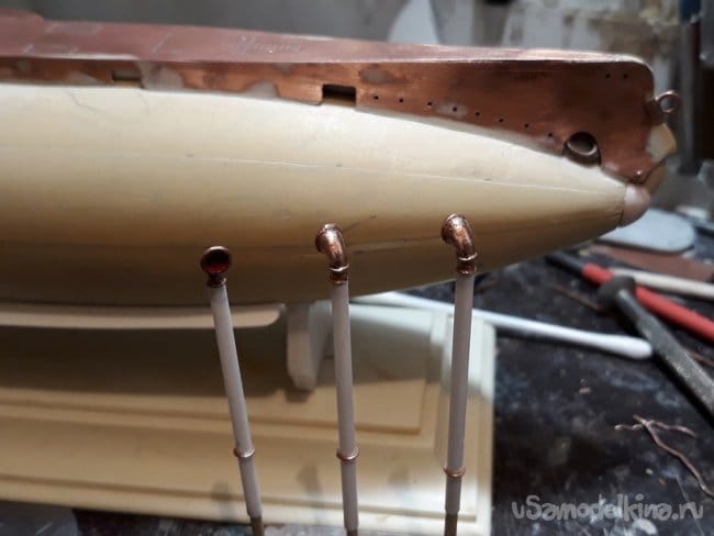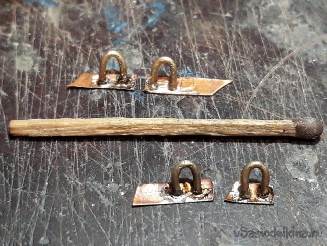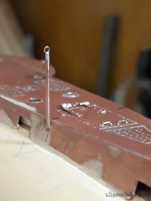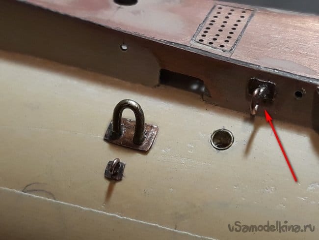 Затем согнул из проволоки, спаял и установил на место якорные клюзы по обоим бортам.