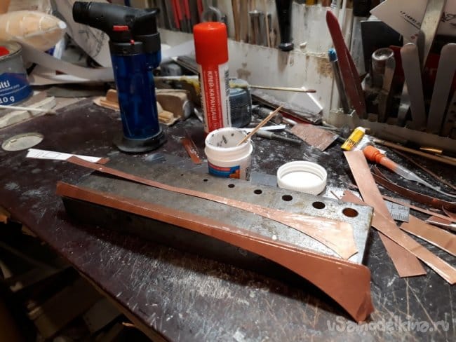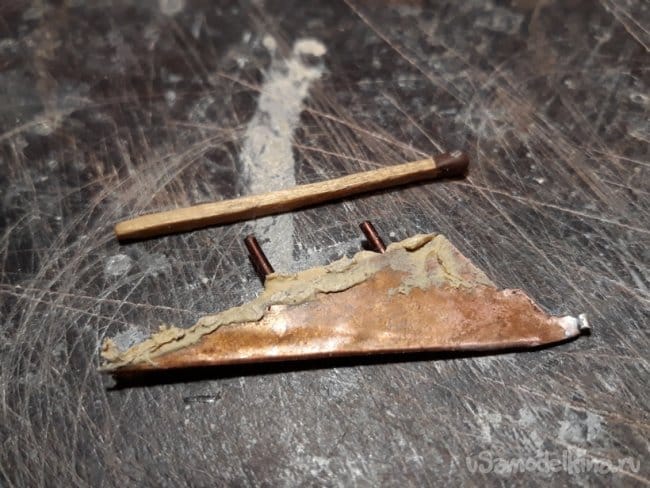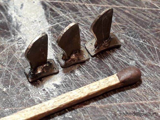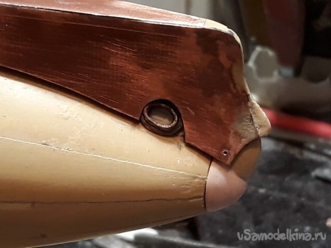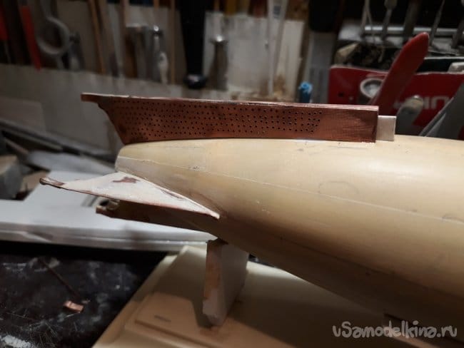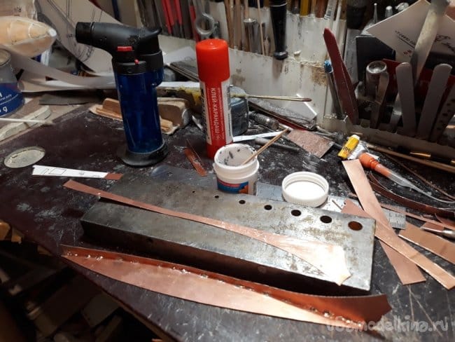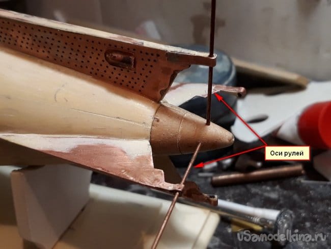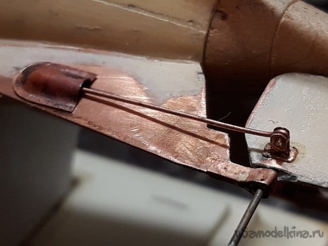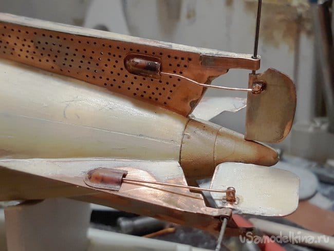 Затем перешёл на винто-рулевую группу деталей. Горизонтальные и вертикальные рули спаял из медной фольги.
