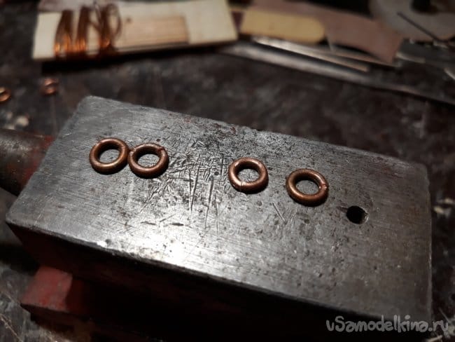 Штурвал спаян из медной проволоки, омеднен, отполирован и покрыт глянцевым лаком.