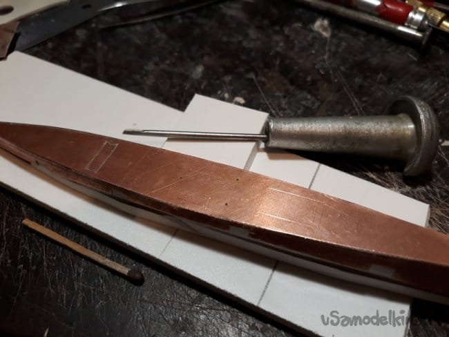 Далее я занялся надстройками. Скопировал с чертежа профиль палубы и боковин. Вырезал и наклеил на фольгированный текстолит. Вырезал из текстолита.