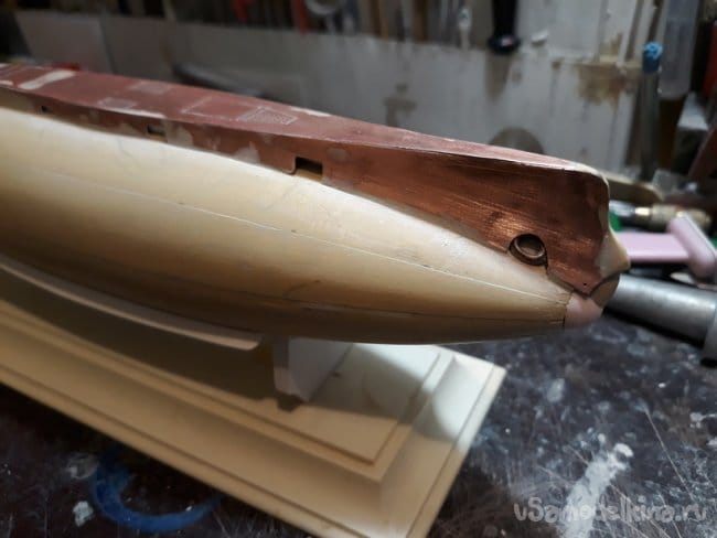 Выточил крышку торпедного аппарата и подогнал по месту с учетом носовой надстройки. Если прикинуть, то должно получиться так.