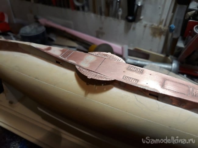 Вот тут понял, что поторопился с пайкой палубы к боковинам. Надо было нанести разметку решеток и просверлить отверстия. Но, выкрутился и все это сделал на почти готовой надстройке, при помощи штихеля и ручной сверлилки.