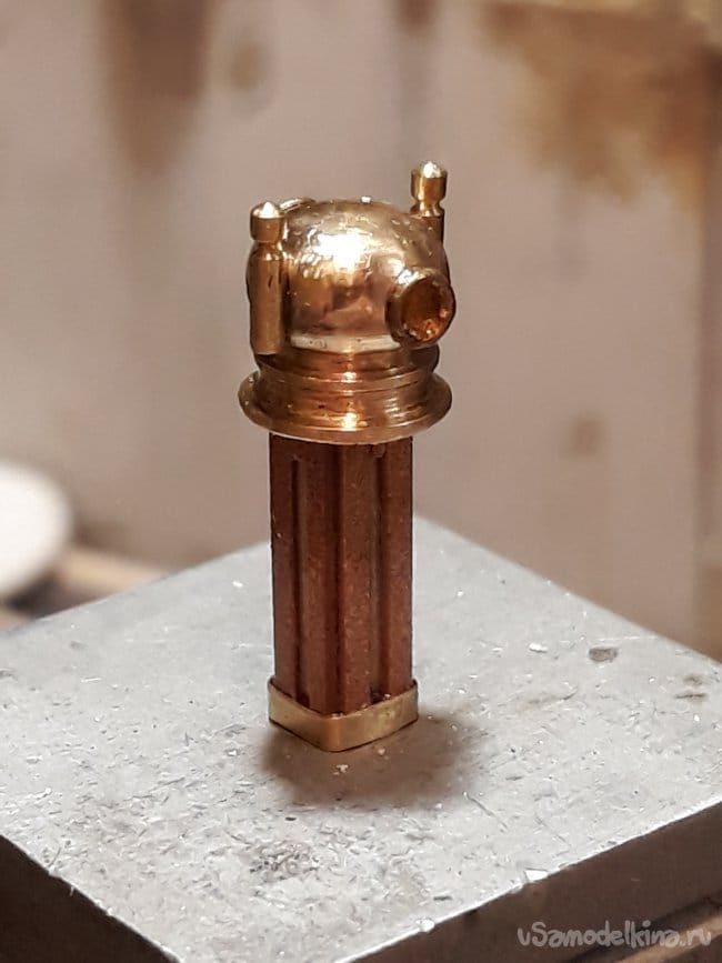 Компас выточен из латунного прутка, нактоуз набран из дерева в соответствии с подлинным компасом переданным шведами с места гибели подлодки.