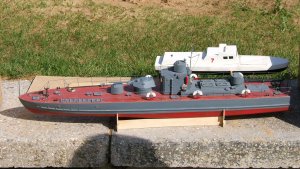 Она выглядит более достоверно и более детализованной по сравнению с уже построенными моделями этой лодки. В строительстве модели мне оказал помощь Александр Михеев, сделав некоторые детали лазерной резкой. Это таблички с названием лодки, установленные на борту модели, и решетчатые обвесы орудийной площадки сделаны им. Смотрится очень натурально. Спасибо ему огромное.