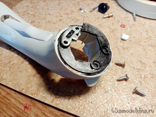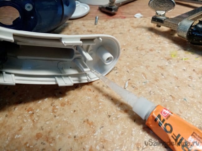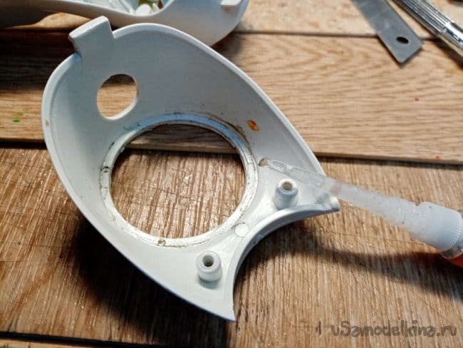 Обнаружил небольшую трещину на пестике крепления потайного винтика. Проклеиваю циакрином и поверх приплавляю паяльником.